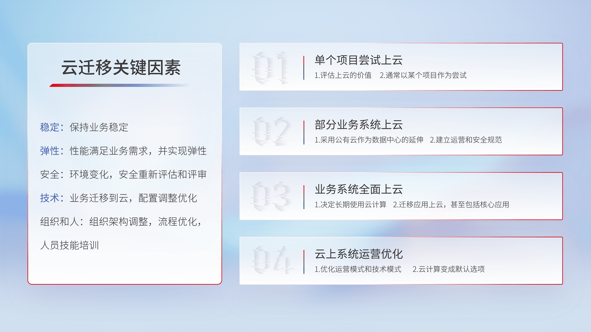 结合实际业务,,,,从规划设计、、、、云平台选型、、云原生改造、、、数据迁移、、、集成交付,,,迁移全过程为客户识别最佳上云路径,,做好风险识别管理,,,设计网络架构、、、身份权限、、、、安全审计合规、、操作审计、、、日志审计、、、监控告警策略、、、、多站点容灾设计等,,,,对云上基础设施进行整体规划,,提升IT治理水平,,,,以满足弹性、、、、高可用、、高性能的需求。。。。