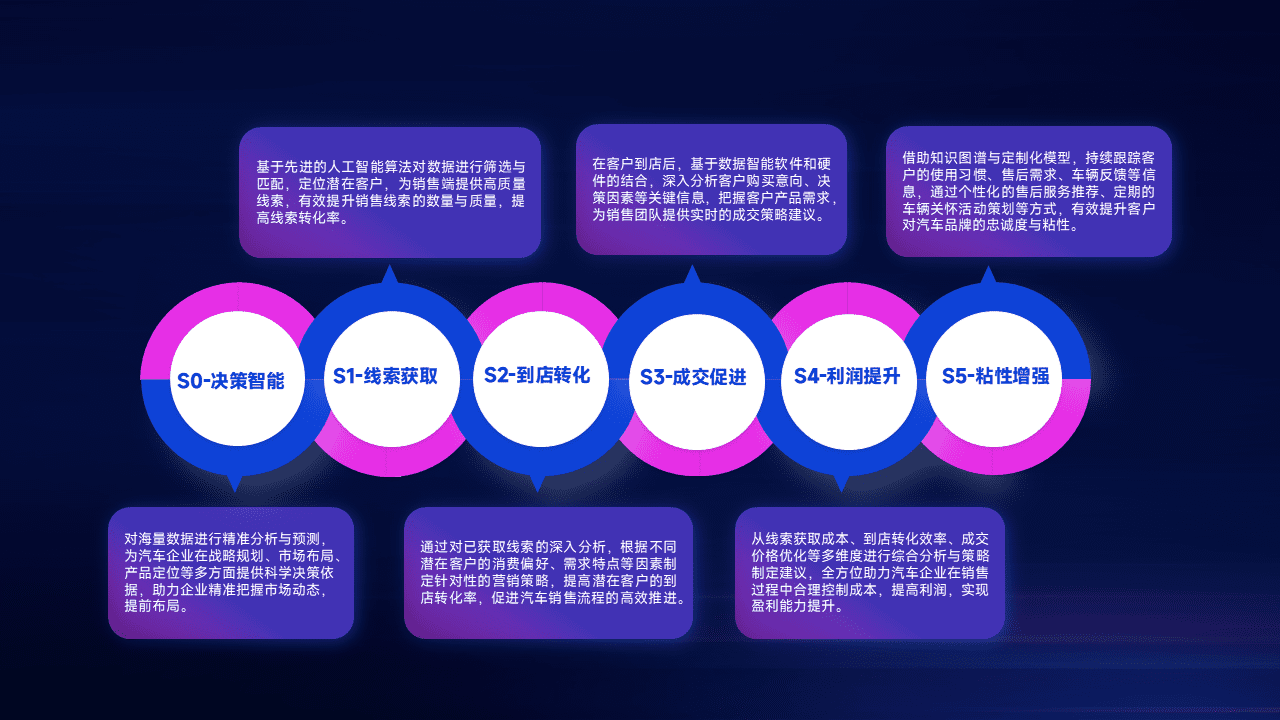 通过拓宽潜在客户来源、、优化线索分配并提高到店转化率,,以增强销售效率。。同时,,利用线索数据不断优化分析模型,,,,有效提升转化率,,,扩大营销影响力。。